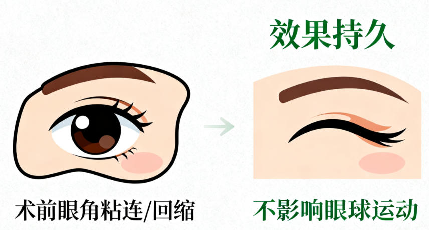 | 外眦回缩2mm | 下睑提升 + 外眦固定 | 眼裂增大,无回缩 |